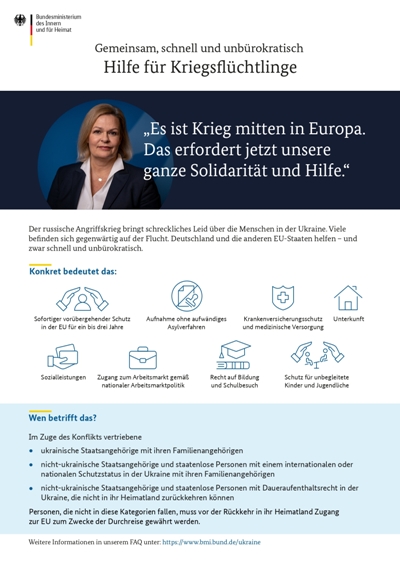 Auf der Internetseite der Beauftragten der Bundesregierung für Migration, Flüchtlinge und Integration wurden Fragen und Antworten zur Einreise Geflüchteter aus der Ukraine sowie zu ihrem Aufenthalt in Deutschland veröffentlicht (Stand: 07.03.2022).