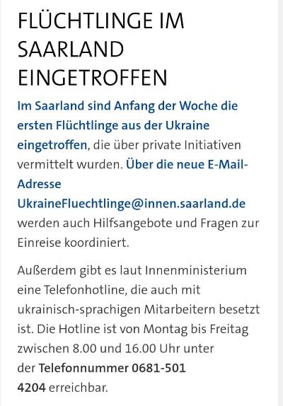 Sollten Sie Verwandte, Freunde und Bekannte in der Ukraine haben, können diese schnell und unkompliziert im Saarland aufgenommen werden. Es wird darum gebeten, die Ankunft von Bürgerinnen und Bürgern aus der Ukraine auch unter der E-Mail-Adresse Diese E-Mail-Adresse ist vor Spambots geschützt! Zur Anzeige muss JavaScript eingeschaltet sein! anzumelden.