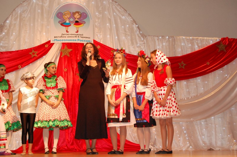 Далее Юлия Рыбалко подчеркнула, что целью фестиваля является не только показать таланты и способности наших детей, не только познакомить немецкую публику с величайшей многоликой культурой России, но и дать возможность детям – участникам фестиваля из разных городов Германии увидеть творчество других коллективов и познакомиться друг с другом, найти новых друзей среди юных соотечественников.