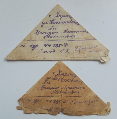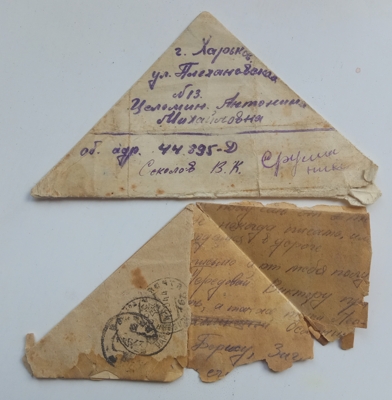 Это два фронтовых треугольника моего двоюродного дедушки. На самом деле, когда он ушел на фронт добровольцем, ему было всего 17 лет - столько же, как и мне сейчас. Звали его Виктор Карлович Соколов. Когда я держу в руках эти очень ветхие, написанные химическим карандашом письма, я невольно спрашиваю себя: а хватило бы у меня смелости пойти на фронт добровольцем и стать сапёром, как он?